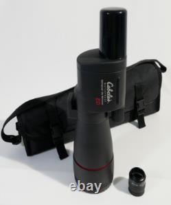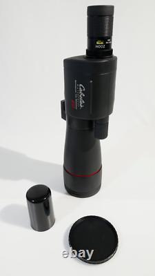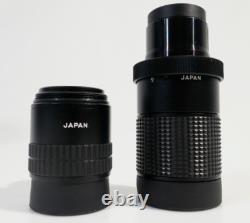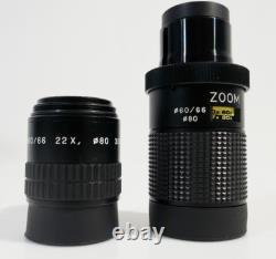 In addition to the scope itself, listing includes. 22x fixed focal length eyepiece (maker undetermined but stamped "Japan"). 20x-60x zoom eyepiece (stamped "Japan"; likely made by Mirador). Original screw-on objective cap and screw-on rear cap. Original neoprene-lined nylon case with dual closures and strap.