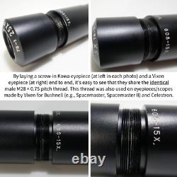 50/60S, 45-degree 60S, R-60S, Japanese-made Tasco scopes, and older scopes made by Vixen for Celestron (SS50, SS60) and Bushnell e. Spacemaster I and II, all of which share the same M28 x 0.75 thread (see Kowa/Vixen thread comparison in photos). Usage tip: Eyepiece magnification is calculated by dividing the focal length of the optical system by the focal length of the eyepiece. As this eyepiece provides 40X magnification with the TS-1 or TS-2, which have a focal length of 420mm, it can be deduced that the focal length of the eyepiece is 10.5mm i.