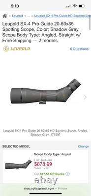 Like new leupold SX-4 Pro guide 20-60x85 spotting scope. Has always had the cover on it and shows no sign of wear on the glass or body.