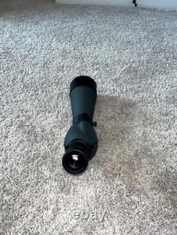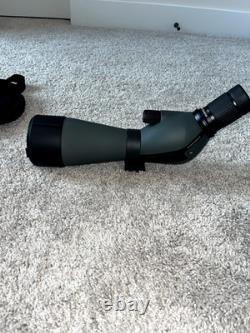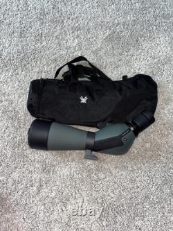 The Vortex DBK-60A1 Diamondback Angled Spotting Scope is a high-quality optical device designed specifically for hunting applications. With a maximum magnification of 60x and fully multi-coated lenses, this spotting scope provides clear and detailed views of distant objects. The angled body design allows for more comfortable viewing, while the waterproof feature ensures protection in various weather conditions. Additionally, the zoom lens feature allows for precise focusing and magnification adjustments, making it a versatile tool for hunters seeking to identify and track game effectively. Comes with protective case used for holding, storing, and protecting the scope.