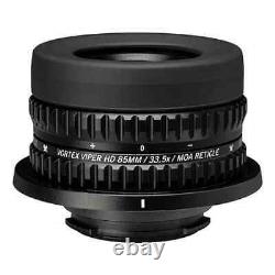 Introducing Vortex's Viper HD 85mm Spotting Scope Reticle Eyepiece. With a fixed magnification of 33.5x, you'll have all the power you need and with the rotatable diopter ring you have the ability to rotate the reticle to match the horizon and obtain razor-sharp focus. The XRT and ArmorTek® lens coatings will keep your optic crystal-clear. You can get this eyepiece in either a MOA or MRAD.
